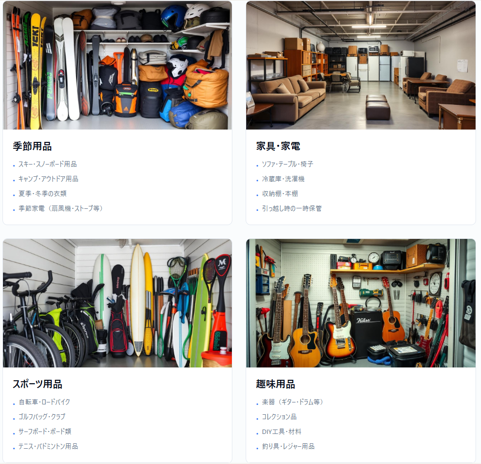 常滑新舞子トランクルームでは、約9畳近くのスペースを有する大型トランクルームと、約4畳の中型トランクルームをご用意しております。季節用品・家具家電・スポーツ用品・アウトドア用品・マリンスポーツ収納にも利用できるほか、車の保管やバイクの保管も可能な広いトランクルームです。